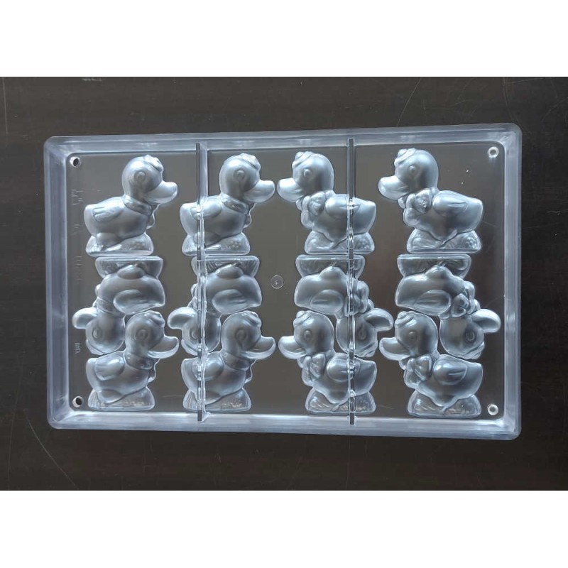 Stampo per cioccolato in policarbonato a forma di papero. Il policarbonato è un materiale sicuro e adatto al contatto con gli alimenti. Garantisce un prodotto inalterato anche alla temperatura di fusione del cioccolato. Dotato di perni e fori posizionati agli angoli, che permettono di incastrare alla perfezione due stampi tra loro. Facile da usare e da pulire. Ideale per le attività commerciali o anche per casa. Made in Italy. Composto da n.12 forme di papero da mm.60x57.
