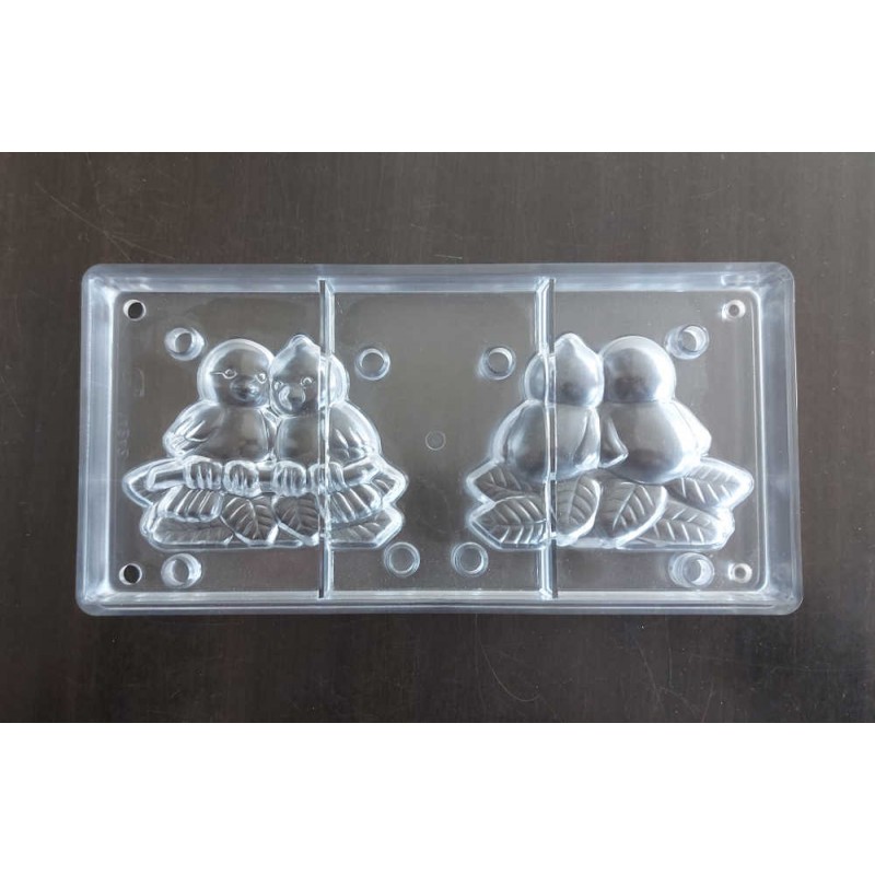 Stampo per cioccolato in policarbonato a forma di uccellini sul ramo. Il policarbonato è un materiale sicuro e adatto al contatto con gli alimenti. Garantisce un prodotto inalterato anche alla temperatura di fusione del cioccolato. Dotato di perni e fori posizionati agli angoli, che permettono di incastrare alla perfezione due stampi tra loro. Facile da usare e da pulire. Ideale per le attività commerciali o anche per casa. Made in Italy. Perfetto per creare n.1 coppia di uccellini sul ramo da mm.110x83.