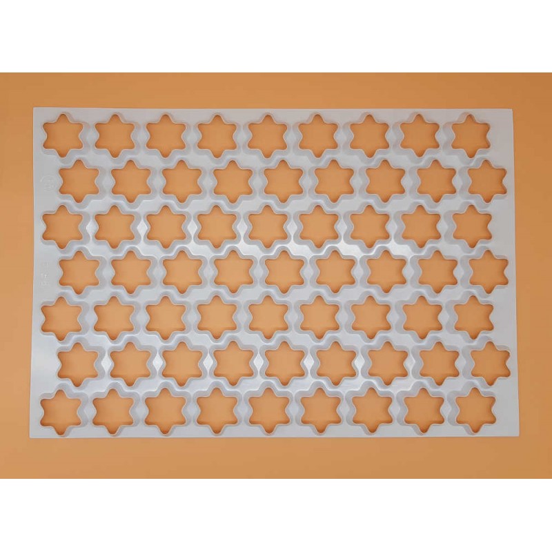 Griglia tagliabiscotti con formato stella da mm.55. Realizzata in materiale plastico di alta qualità. Idoneo al contatto con gli alimenti. Pratico e facile da lavare. Ideale per la produzione di soggetti di pasta frolla, sfoglia ed altri impasti. Si possono realizzare velocemente n.63 biscotti a forma di stella. Dimensioni griglia cm.57,5x39. Utilizzo: mettere la griglia in una teglia di cottura da cm.60x40, stendere la pasta e posizionarla sopra la griglia dalla parte non liscia, passarci sopra con un mattarello in modo da fare cadere i biscotti direttamente nella teglia, già pronti per la cottura. Made in Italy.