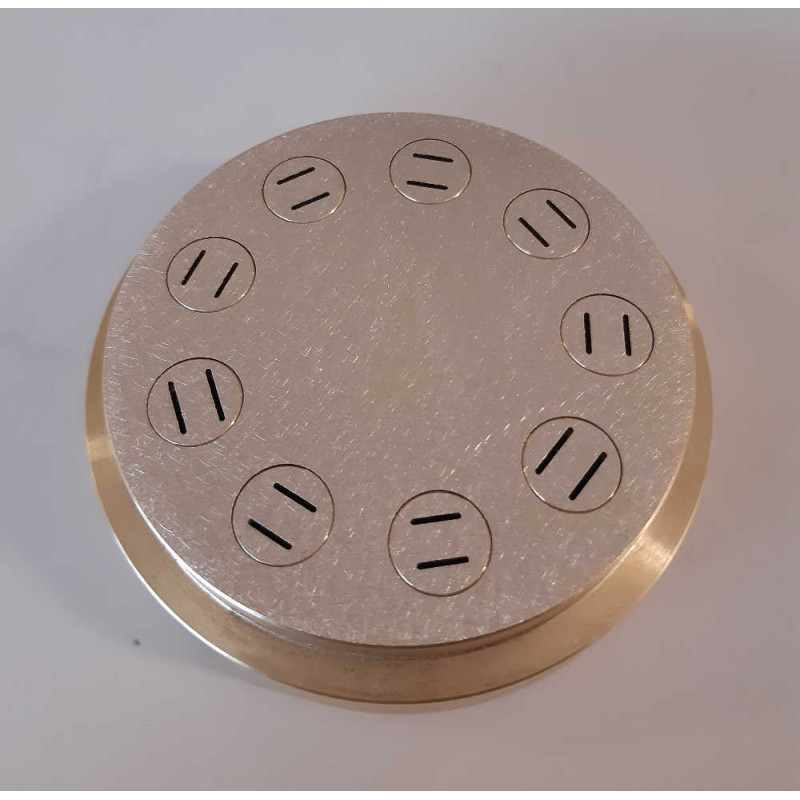 Trafila per la macchina della pasta La Parmigiana mod. D35 o D45. Formato tagliatella da mm.6. Materiale bronzo. Il bronzo fa si che la pasta rimanga più ruvida. Made in Italy. Diametro stampo cm.8,7 sotto. Misura e spessore tagliatella anche su richiesta.