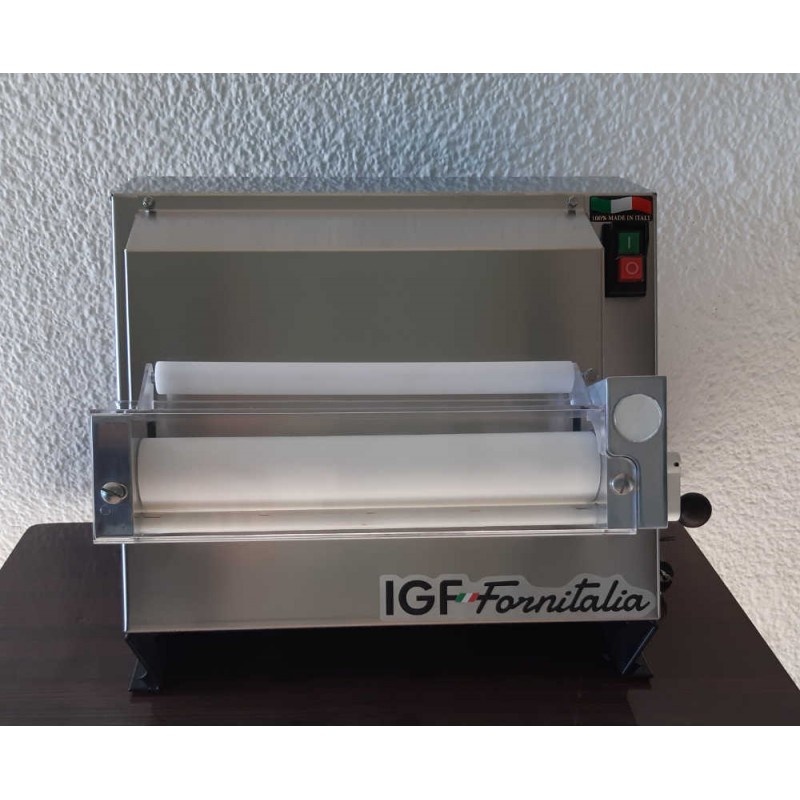 Stendipasta inox. Ideale per spianare impasti per preparare pizza, pane, pasta per primi piatti, focacce, tortine ed altro. Dotato di rulli regolabili, per una precisione millimetrica dello spessore desiderato e protezione rulli. Monofase. Lunghezza rullo cm.30. Dimensioni macchina cm.42x42 h37.