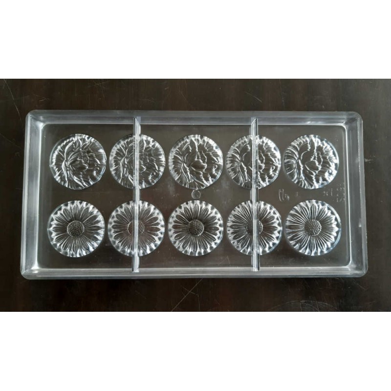 Stampo per cioccolato in policarbonato a forma di 2 tipi di fiore. Il policarbonato è un materiale sicuro e adatto al contatto con gli alimenti. Garantisce un prodotto inalterato anche alla temperatura di fusione del cioccolato. Facile da usare e da pulire. Ideale per le attività commerciali o anche per casa. Made in Italy. Composto da n.5+5 forme di fiore da diam. mm.44h4 da gr.7 cad.
