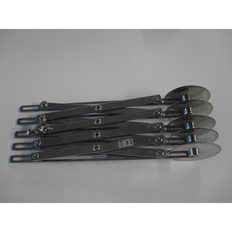 Tagliapasta in acciaio inox, regolabile, estensibile. Chiamato dagli chef e dai pasticcieri anche "bicicletta". Dotato di dispositivo di bloccaggio per mantenere la larghezza desiderata durante la fase di taglio, così da evitare il rischio di righe storte o non uniformi. Professionale. E' formato da 5 lame lisce da cm.5,5. Ideale per tagliare strisce di pasta tutte uguali da cm.1 fino a cm.12,5.