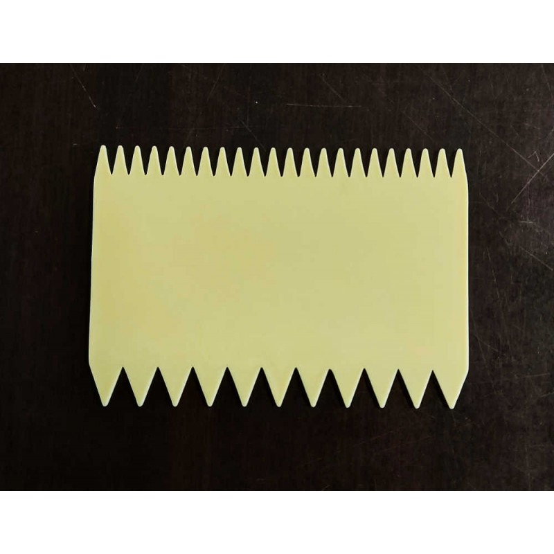 Raschietto rettangolare a doppia dentatura da cm.11x8. In plastica PP di colore avorio. Idoneo al contatto con alimenti. Lavabile in lavastoviglie. Ideale per decorazioni.
