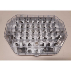 Set di n.52 beccucci misti in acciaio inox per decorazioni, n.1 adattatore per sacchetto a poche e n.2 chiodi per fiori. Idonei al contatto con alimenti. Lavabili anche in lavastoviglie. Contenuti in una comoda scatola in plastica bianca con coperchio trasparente da cm.25x17,5.