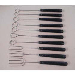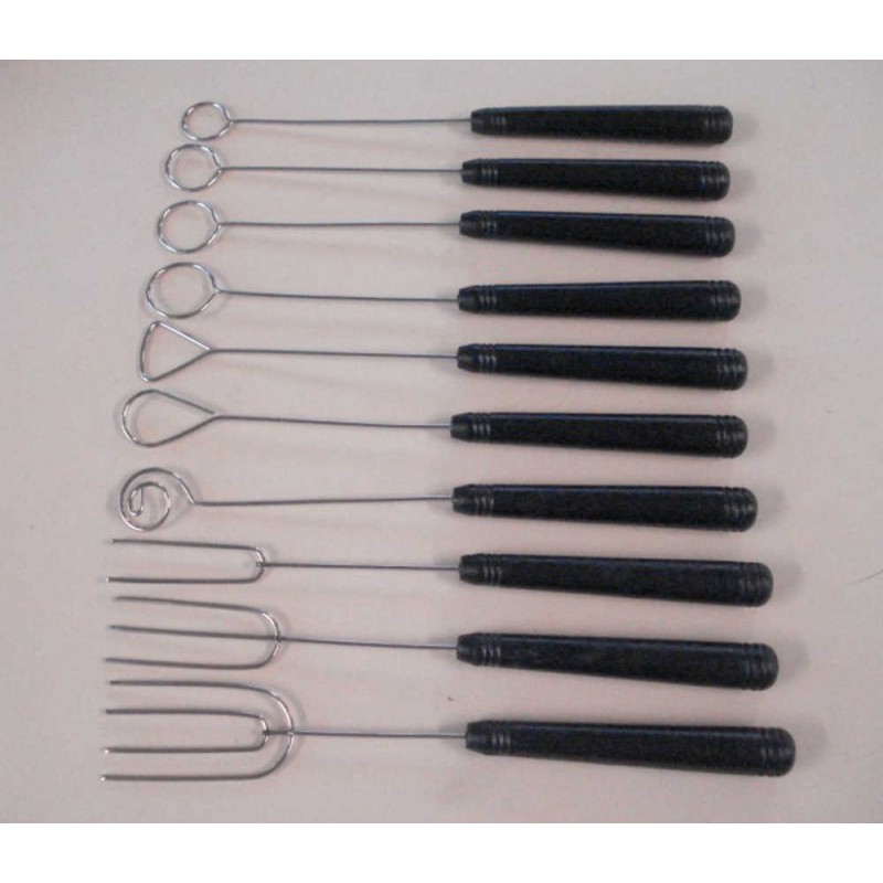 Set di 10 forchette per cioccolato in acciaio inox con impugnatura in plastica nera, indispensabili per preparare e decorare i cioccolatini. Ideali per essere immerse nel cioccolato senza che le impronte rovinerebbero il rivestimento esterno. Con le diverse forme (triangolo, goccia, spirale, circolari, 2/3/4 punte) si possono ottenere varie decorazioni.