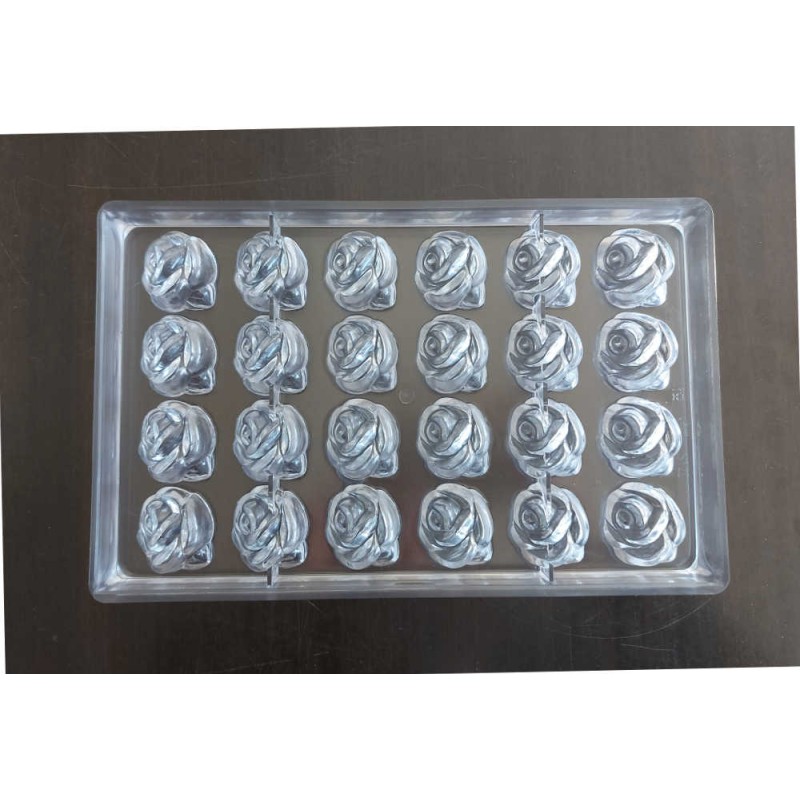 Stampo per cioccolato in policarbonato a forma di rosa. Il policarbonato è un materiale sicuro e adatto al contatto con gli alimenti. Garantisce un prodotto inalterato anche alla temperatura di fusione del cioccolato. Facile da usare e da pulire. Ideale per le attività commerciali o anche per casa. Made in Italy. Composto da n.24 forme di rosa da mm.34x30h20.