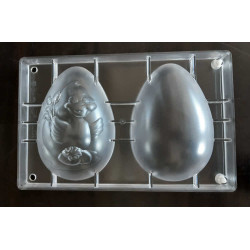 Stampo in policarbonato per uova di cioccolato con decorazione coniglio. Il policarbonato è un materiale sicuro e adatto al contatto con gli alimenti. Garantisce un prodotto inalterato anche alla temperatura di fusione del cioccolato. Facile da usare e da pulire. Ideale per le attività commerciali o anche per casa. Made in Italy. Costituito da una coppia. Dotato di perni e fori posizionati agli angoli, che permettono di incastrare alla perfezione due stampi tra loro per poter realizzare due uova di Pasqua con coniglio. Sono l'ideale per chi ama personalizzare le proprie uova di cioccolato con decorazioni e sorprese originali. Misura mm.149x100.