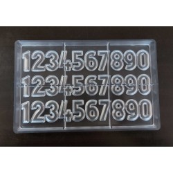 Stampo per cioccolato in policarbonato a forma di numeri. Il policarbonato è un materiale sicuro e adatto al contatto con gli alimenti. Garantisce un prodotto inalterato anche alla temperatura di fusione del cioccolato. Facile da usare e da pulire. Ideale per le attività commerciali o anche per casa. Made in Italy. Perfetto per creare n.3 serie di numeri da h mm.39.