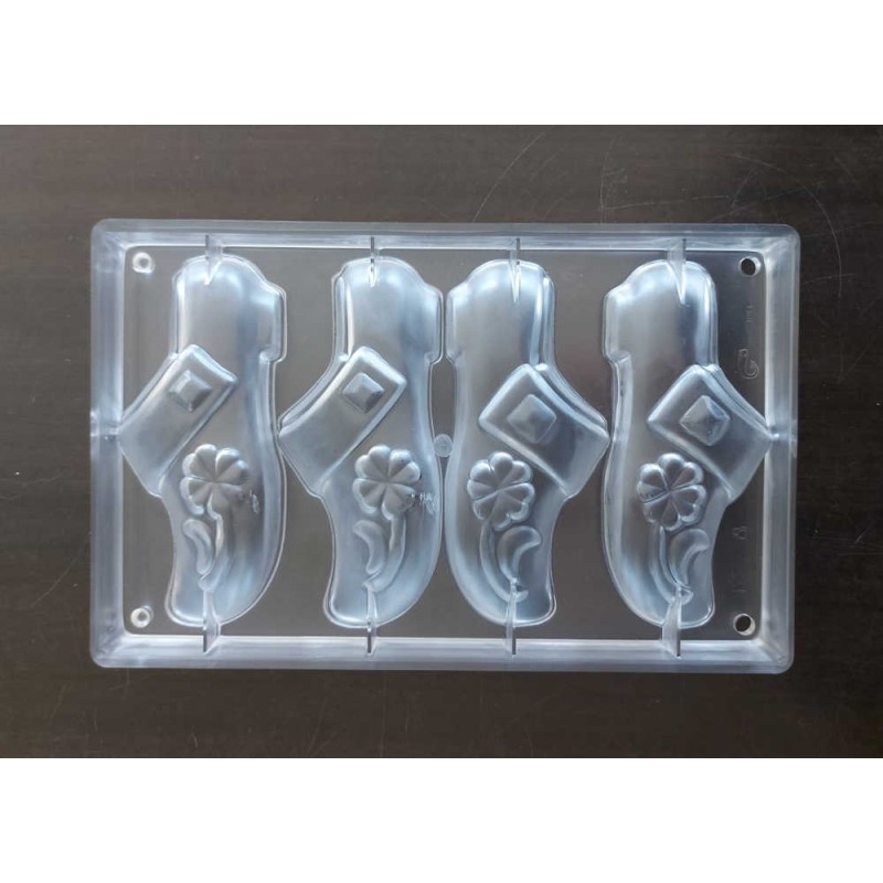 Stampo per cioccolato in policarbonato a forma di zoccoletti. Il policarbonato è un materiale sicuro e adatto al contatto con gli alimenti. Garantisce un prodotto inalterato anche alla temperatura di fusione del cioccolato. Dotato di perni e fori posizionati agli angoli, che permettono di incastrare alla perfezione due stampi tra loro. Facile da usare e da pulire. Ideale per le attività commerciali o anche per casa. Made in Italy. Composto da n.2 coppie di zoccoletti da mm.150x38.