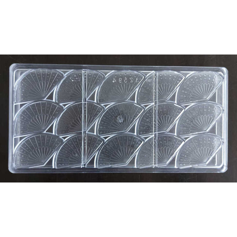 Stampo per cioccolato in policarbonato a forma di ventaglio. Il policarbonato è un materiale sicuro e adatto al contatto con gli alimenti. Garantisce un prodotto inalterato anche alla temperatura di fusione del cioccolato. Facile da usare e da pulire. Ideale per le attività commerciali o anche per casa. Made in Italy. Composto da n.15 forme di ventaglio da mm.66x36h4.