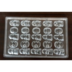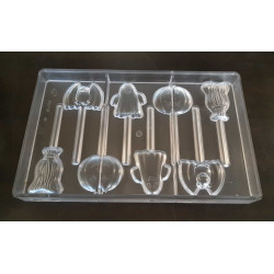 Stampo per cioccolato in policarbonato a forma di soggetti di halloween stick. Il policarbonato è un materiale sicuro e adatto al contatto con gli alimenti. Garantisce un prodotto inalterato anche alla temperatura di fusione del cioccolato. Facile da usare e da pulire. Ideale per le attività commerciali o anche per casa. Made in Italy. Composto da n.8 forme di soggetti di halloween stick (scopa, pipistrello, zucca e fantasma) da mm.275x175 e gr.14,5.