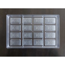 Stampo per cioccolato in policarbonato a forma di lingotto. Il policarbonato è un materiale sicuro e adatto al contatto con gli alimenti. Garantisce un prodotto inalterato anche alla temperatura di fusione del cioccolato. Facile da usare e da pulire. Ideale per le attività commerciali o anche per casa. Made in Italy. Composto da n.16 forme di lingotto da mm.49x29h12.