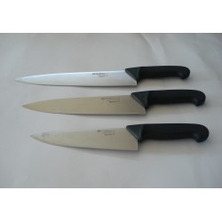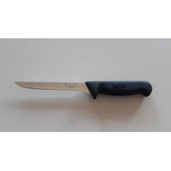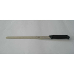 Coltello salmone Bufalo leader nella produzione di coltelli professionali. Lama alveolata in acciaio inossidabile perfetta per una lunga durata e manico in gomma termoplastica di colore nero, atossico ed inattaccabile dagli acidi, ergonomico per una presa sicura. Il taglio ondulato è perfetto anche per le fette più fini in quanto non rimangono attaccate alla lama e non si rovinano. Scelto dal cuoco, dallo chef e dal pescivendolo. Lunghezza lama cm.30.