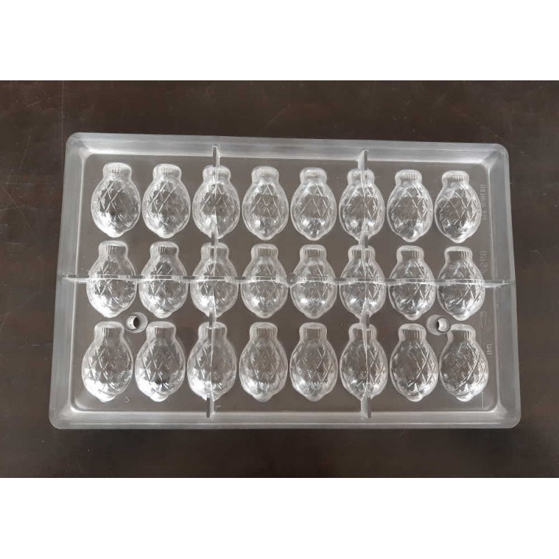 Stampo per cioccolato in policarbonato a forma di ananas. Il policarbonato è un materiale sicuro e adatto al contatto con gli alimenti. Garantisce un prodotto inalterato anche alla temperatura di fusione del cioccolato. Facile da usare e da pulire. Ideale per le attività commerciali o anche per casa. Made in Italy. Composto da n.24 forme di ananas da mm.43x26h14.