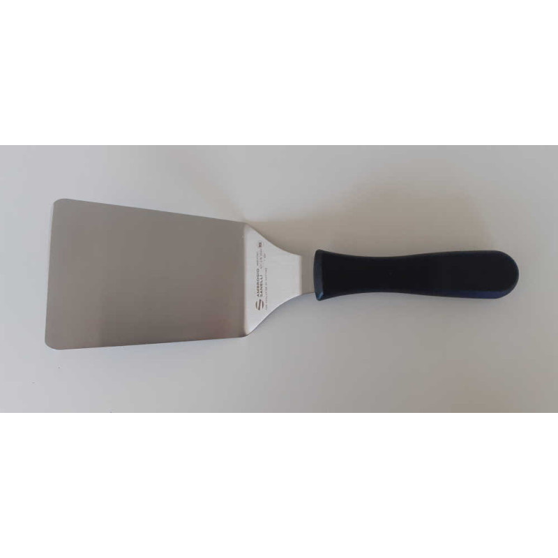 Spatola in acciaio inox con manico plastica nero. Idonea al contatto con gli alimenti. Ideale per servire pizza, lasagne, parmigiana, sformati o anche dolci e simili. Misura cm.15x9. Professionale.