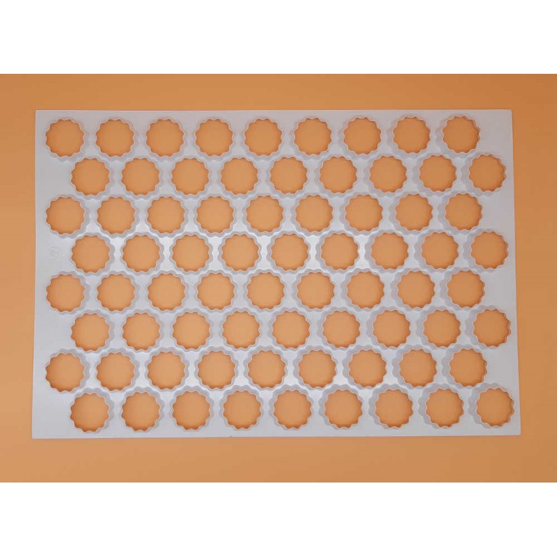 Griglia tagliabiscotti con formato cerchio zigrinato da mm.45. Realizzata in materiale plastico di alta qualità. Idoneo al contatto con gli alimenti. Pratico e facile da lavare. Ideale per la produzione di soggetti di pasta frolla, sfoglia ed altri impasti. Si possono realizzare velocemente n.72 biscotti a forma di cerchio zigrinato. Dimensioni griglia cm.57,5x39. Utilizzo: mettere la griglia in una teglia di cottura da cm.60x40, stendere la pasta e posizionarla sopra la griglia dalla parte non liscia, passarci sopra con un mattarello in modo da fare cadere i biscotti direttamente nella teglia, già pronti per la cottura. Made in Italy.