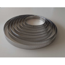 Fascia per semifreddi e torte in acciaio inox microforato. Formato tondo basso. Professionale. Idonea al contatto con gli alimenti. Ideale per la preparazione di torte gelato, mousse, semifreddi, ecc. La foratura garantisce una doratura ottimale e l'evaporazione dell'acqua durante la cottura. Si può utilizzare nel forno per una cottura uniforme, nel frigo, nel congelatore o nell'abbattitore per un veloce raffreddamento.