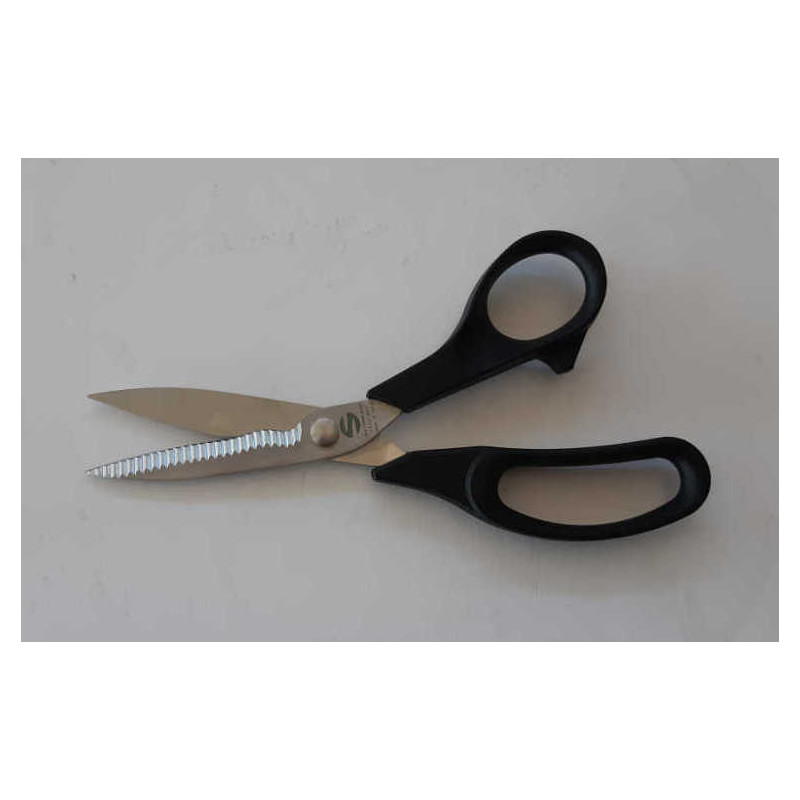 Forbice per pesce professionale Sanelli. Lama dentata in acciaio inox e manico nylon di colore nero. L'impugnatura è pratica e confortevole. Idonea al contatto con gli alimenti. Lavabile in lavastoviglie. Perfetta per pulire il pesce. Lunghezza totale cm.20.