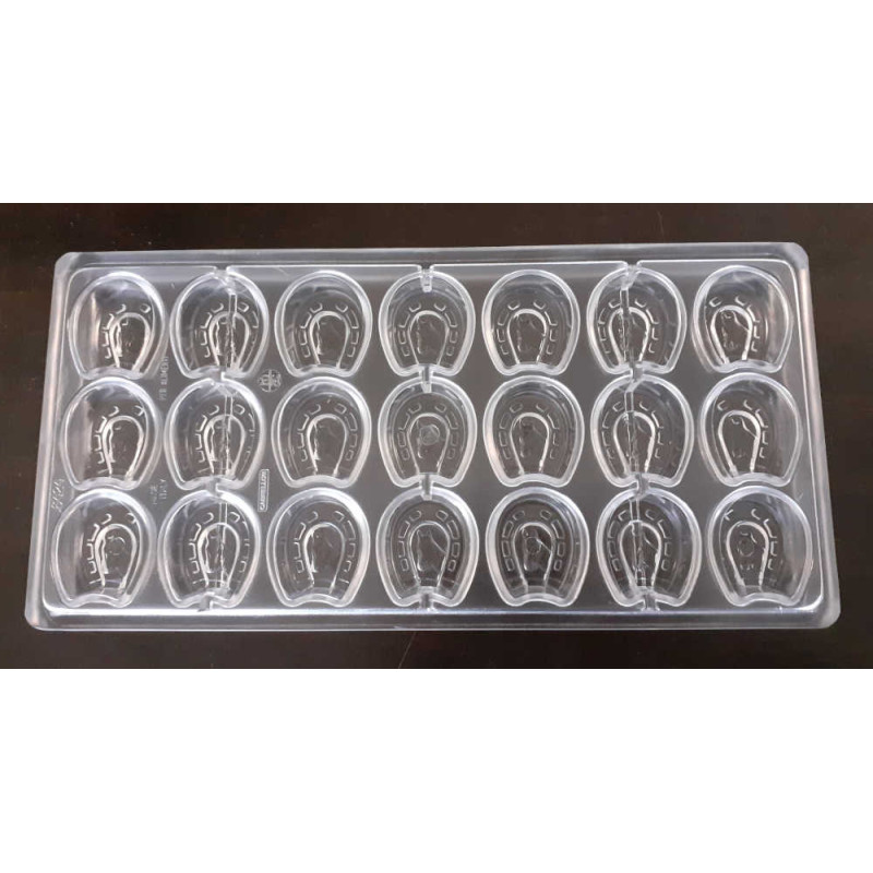 Stampo per cioccolato in policarbonato a forma di ferro di cavallo. Il policarbonato è un materiale sicuro e adatto al contatto con gli alimenti. Garantisce un prodotto inalterato anche alla temperatura di fusione del cioccolato. Facile da usare e da pulire. Ideale per le attività commerciali o anche per casa. Made in Italy. Composto da n.21 forme di ferro di cavallo da mm.34,8x29,3h16,2 gr.13.