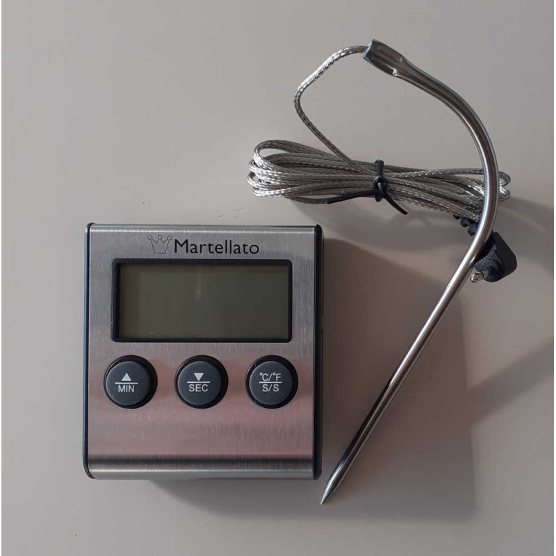 Termometro digitale multifunzione ad immersione e allarme timer. Temperatura -50° + 300°C. La misurazione è veloce e precisa. Pila inclusa. Adatto per misurare la temperatura di cibi, bevande, ecc. Lunghezza filo cm.120. Misura utile sonda cm.10. Misura termometro cm.6,5x7 h 1,8.
