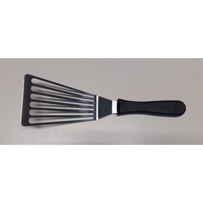 Spatola in acciaio inox con manico plastica nero. Idonea al contatto con gli alimenti. Ideale per fritto. Misura cm.17x9. Professionale. Made in Italy.