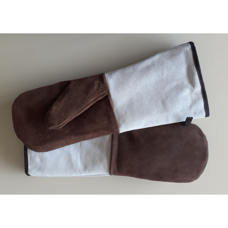 Guanto da forno in pelle con rivestimento interno. Resistente fino a 250°. Professionale. Dotato di pollice e manopola. Colore marrone. Ideale nei panifici, pasticcerie, gastronomie, pizzerie e ristoranti. Lunghezza cm.45.