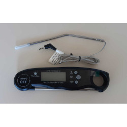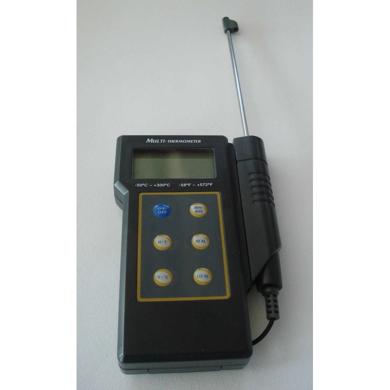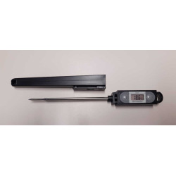 Termometro digitale con sonda in acciaio inox da cm.14,5. Grande display per la rilevazione della temperatura. La misurazione è veloce e precisa. Dotato di copri punta. Temperatura -50 +300. Pile stilo incluse nella confezione. Adatto per misurare la temperatura di cibi e bevande. Misura termometro cm.14x9,5.