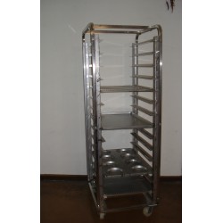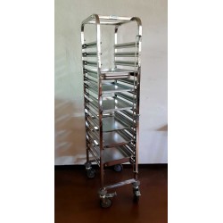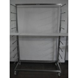 Carrello portateglie a pioli a 15/20 posti. Struttura in ferro zincato. Dotato di 4 ruote in nylon. Per uso professionale. Ideale per panetterie e pasticcerie. Misura cm.52x56h184. Su richiesta è possibile realizzarlo su misura.