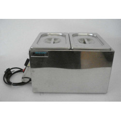 Bagnomaria elettrico con comandi frontali. Realizzato completamente in acciaio inox. Ideale per sciogliere il cioccolato, riscaldare o mantenere calde vivande di qualsiasi tipo, con recipienti immersi in acqua calda riscaldata da resistenza elettrica. La monopolo per la regolazione della temperatura va da 0°a 90°. Monofase 220 volt. 1200 watt. Made in Italy. Misura cm.27,5x41h25 a 2 vasche da lt.5 cadauno.