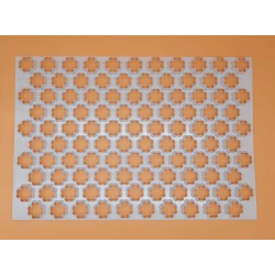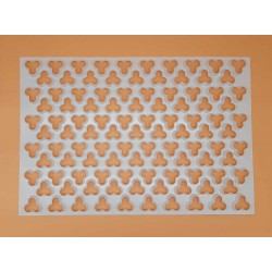 Griglia tagliabiscotti con formato trifoglio mm.30. Realizzata in materiale plastico di alta qualità. Idoneo al contatto con gli alimenti. Pratico e facile da lavare. Ideale per la produzione di soggetti di pasta frolla, sfoglia ed altri impasti. Si possono realizzare velocemente n.105 biscotti a forma di trifoglio. Dimensioni griglia cm.57,5x39. Utilizzo: mettere la griglia in una teglia di cottura da cm.60x40, stendere la pasta e posizionarla sopra la griglia dalla parte non liscia, passarci sopra con un mattarello in modo da fare cadere i biscotti direttamente nella teglia, già pronti per la cottura. Made in Italy.