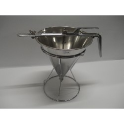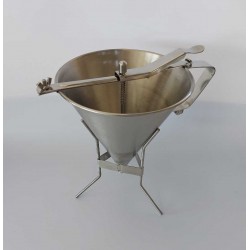 Imbuto dosatore in acciaio inox, professionale. Idoneo al contatto con gli alimenti. Completo di n.1 ugello (5 mm) e supporto ad anello per mantenere l'imbuto in posizione verticale dopo l'uso. Ideale per le decorazioni con salse, panna e coulis, o per stampi da biscotti o cioccolatini ecc. Capacità 1,9 litri, diametro 200 mm e altezza 210 mm.