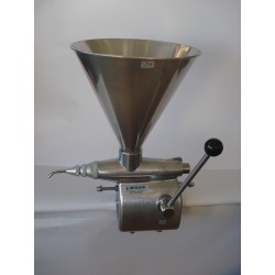 Riempitrice per crema professionale. Corpo macchina in fusione d'alluminio. Imbuto, cilindro, pistone iniettori, leva, nasello e beccuccio sono in acciaio inox. L'assenza di vernici ed il trattamento di brillantatura garantiscono qualità e igiene. Con regolazione dosaggio prodotto. Dotata di incavo e viti per essere fissata al tavolo. Attrezzo indispensabile per chi desidera soddisfare la propria clientela nel modo migliore con un prodotto fresco ed impeccabile, guarnito con cura e regolarità. Modello Mini misura cm.25 h44 lt.3.
