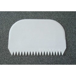 Raschietto rettangolare a doppia dentatura da cm.11x8. In plastica PP di colore avorio. Idoneo al contatto con alimenti. Lavabile in lavastoviglie. Ideale per decorazioni.