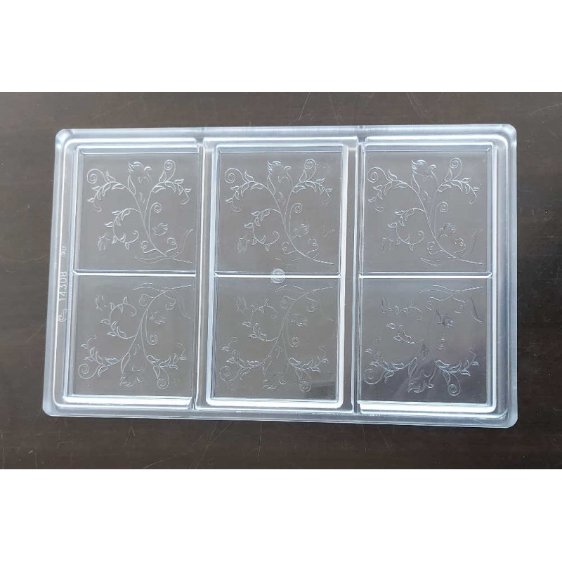 Stampo per cioccolato in policarbonato a forma di tavoletta lavorata. Il policarbonato è un materiale sicuro e adatto al contatto con gli alimenti. Garantisce un prodotto inalterato anche alla temperatura di fusione del cioccolato. Facile da usare e da pulire. Ideale per le attività commerciali o anche per casa. Made in Italy. Composto da n.6 forme di tavoletta lavorata da mm.75x75h6,9.
